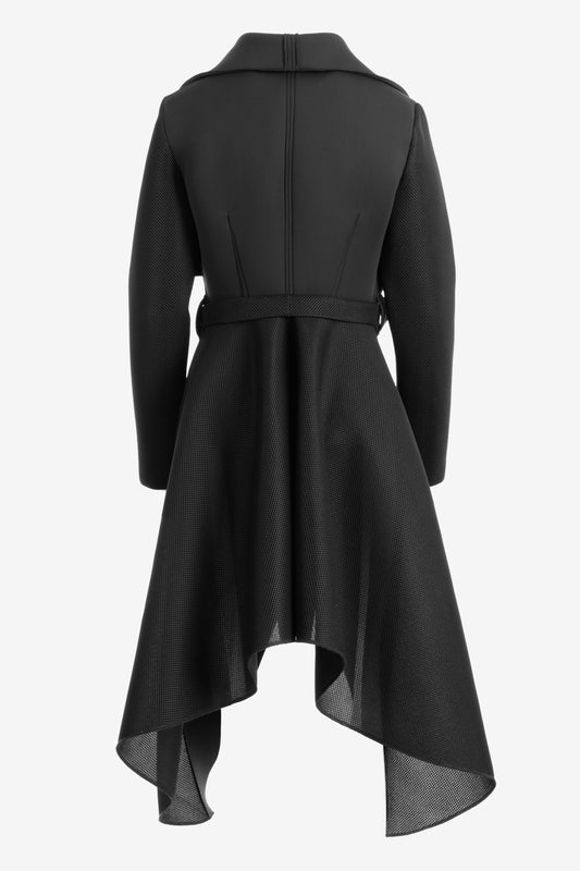 Black Asymmetric Neoprene Coat with Sculptural Collar and Belt