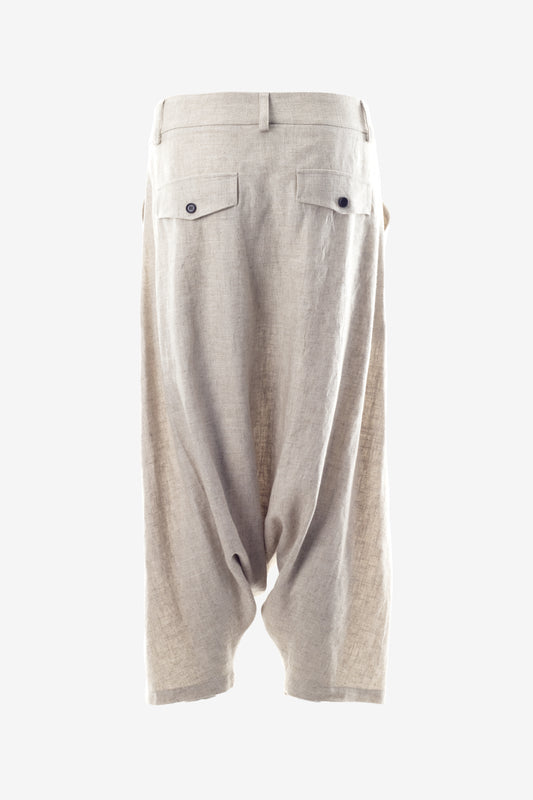 Asymmetric Drop Crotch Linen Pants with Pleats and Decorative Back Flaps – Cropped Unisex Trousers by Jana Coshe