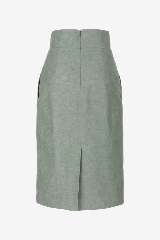 Pleated Linen Midi Skirt with Wide Waistband and Pockets